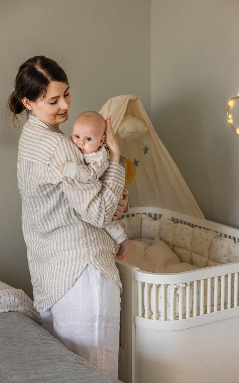 Wichtig ist auch, dass das Kind auf einer festen Matratze liegt, damit es nicht einsinkt. Bei einer zu weichen Matratze könnten die Atemwege blockiert werden. Wenn das Kind in seinem eigenen Bett schläft, sollte die Matratze bis zum Rand des Bettes reichen, damit keine Lücken entstehen, in die das Kind rutschen könnte.