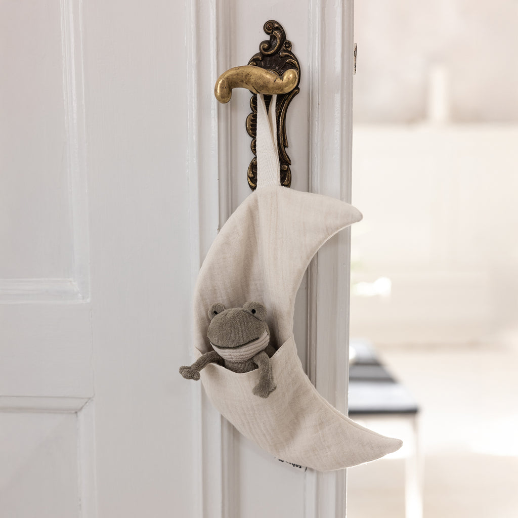 Der Mond ist aus sehr weicher, umweltzertifizierter Baumwolle genäht und lässt sich problemlos am Gitterbett, Wickeltisch oder an anderen Stellen aufhängen, an denen eine kleine Aufbewahrungslösung benötigt wird. Das Design macht ihn nicht nur praktisch, sondern auch hübsch als dekoratives Element im Kinderzimmer.
