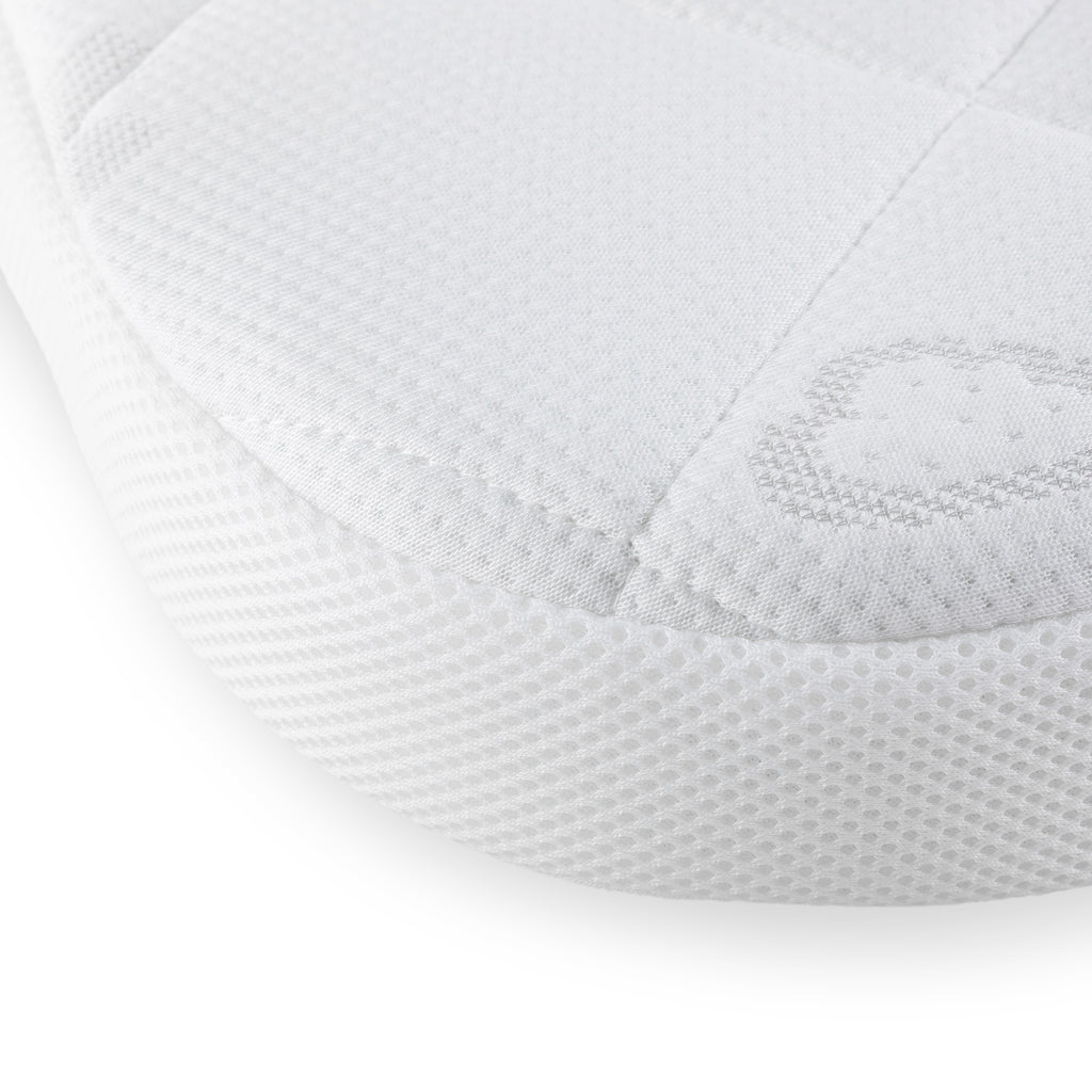 Entlang der Seiten des Bezugs befindet sich ein Keil aus besonders atmungsaktivem Ventilationsmaterial, der für eine optimale Luftzirkulation sorgt, sowie ein Sicherheitsreißverschluss, sodass das Kind den Bezug nicht versehentlich öffnen kann. Sie können den Bezug beispielsweise mit einer Büroklammer öffnen, wenn er bei 60 Grad gewaschen werden muss.